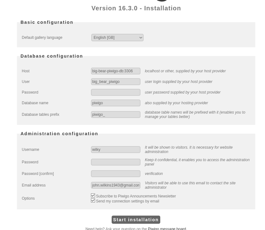Hello @John_Wilkins and welcome here! Try this password for MySQL user big_bear_piwigo