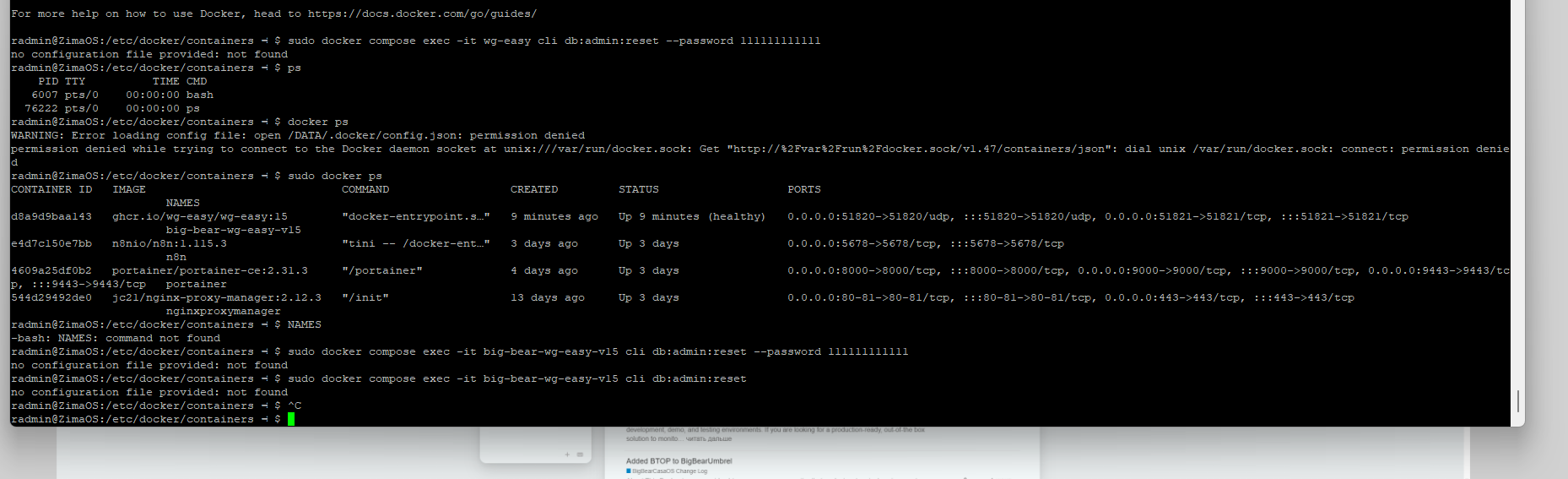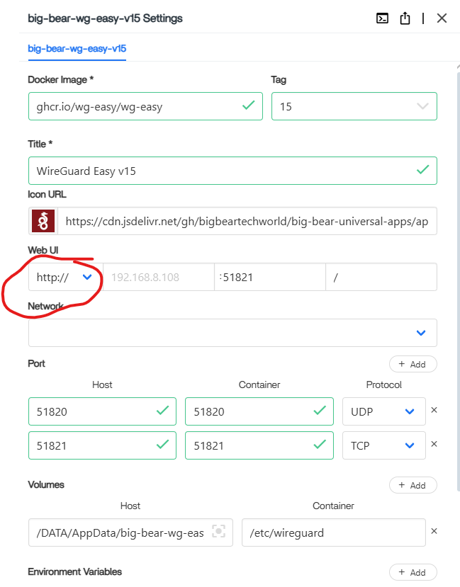 Hi all, I added INSECURE , change my user name change the password to fit 12 characters, delete wg.db in /ZimaOS-HD/AppData/big-bear-wg-easy-v15/data, start and it works