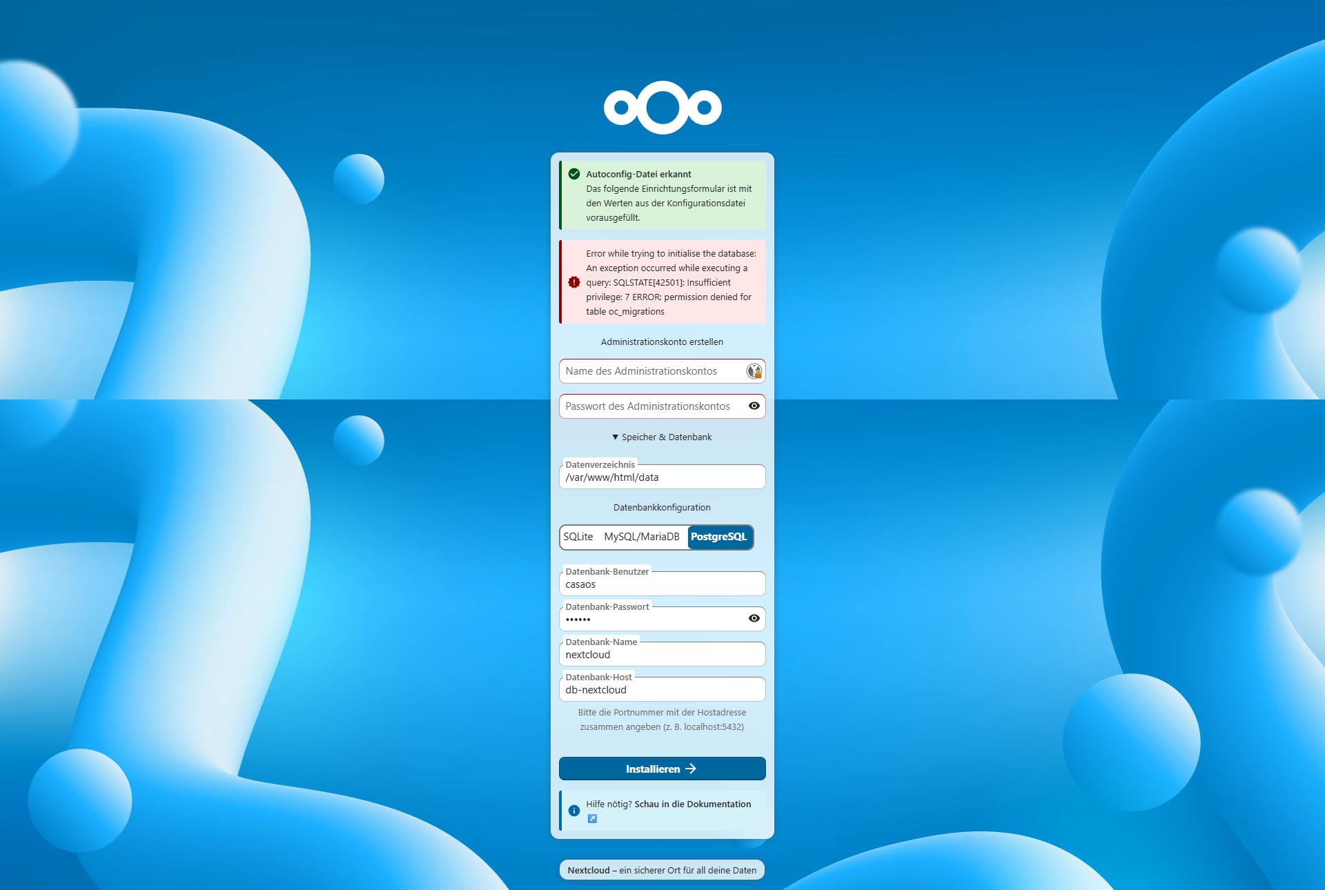 Error while trying to initialise the database: An exception occurred while executing a query: SQLSTATE[42501]: Insufficient privilege: 7 ERROR: permission denied for table oc_migrations
